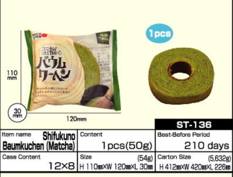 原產料:雞蛋、小麥粉、砂糖、起酥油、麦淇淋、麦芽糖、玉米淀粉、食用乳化油脂、抹茶醬/乳化劑、膨脹劑、山梨糖醇、香料、著色劑(梔子、胡蘿蔔素)、(一部分含有小麥、雞蛋、牛乳成分、大豆,)該生產線有生產使用花生的產品。