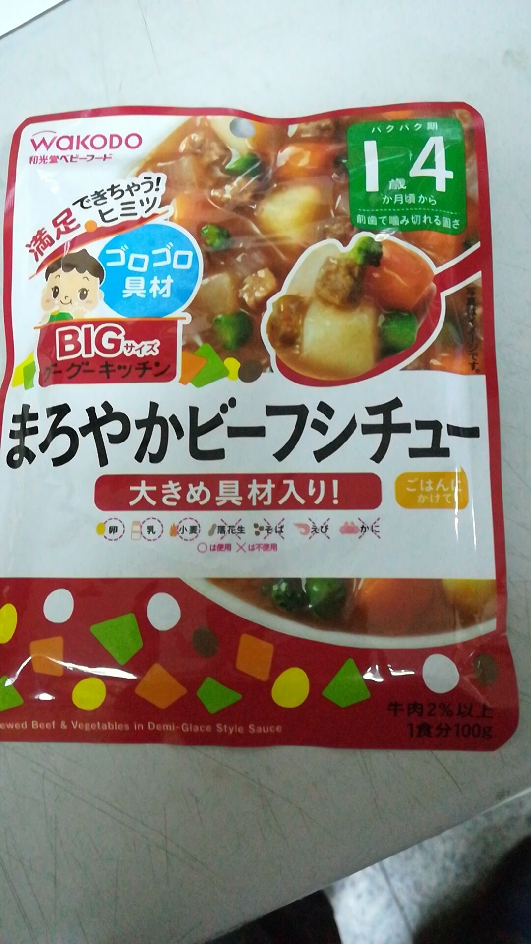 原材料名:蔬菜(胡蘿蔔、洋蔥、綠菜花、扁豆)、土豆、牛肉加工品(牛肉、澱粉、蛋白(含雞蛋)、食鹽)、醬油(含大豆)、番茄泥、番茄醬、蔬菜清湯、蘋果泥、黃油、小麥粉、砂糖、雞精華/增粘剂(加工淀粉)