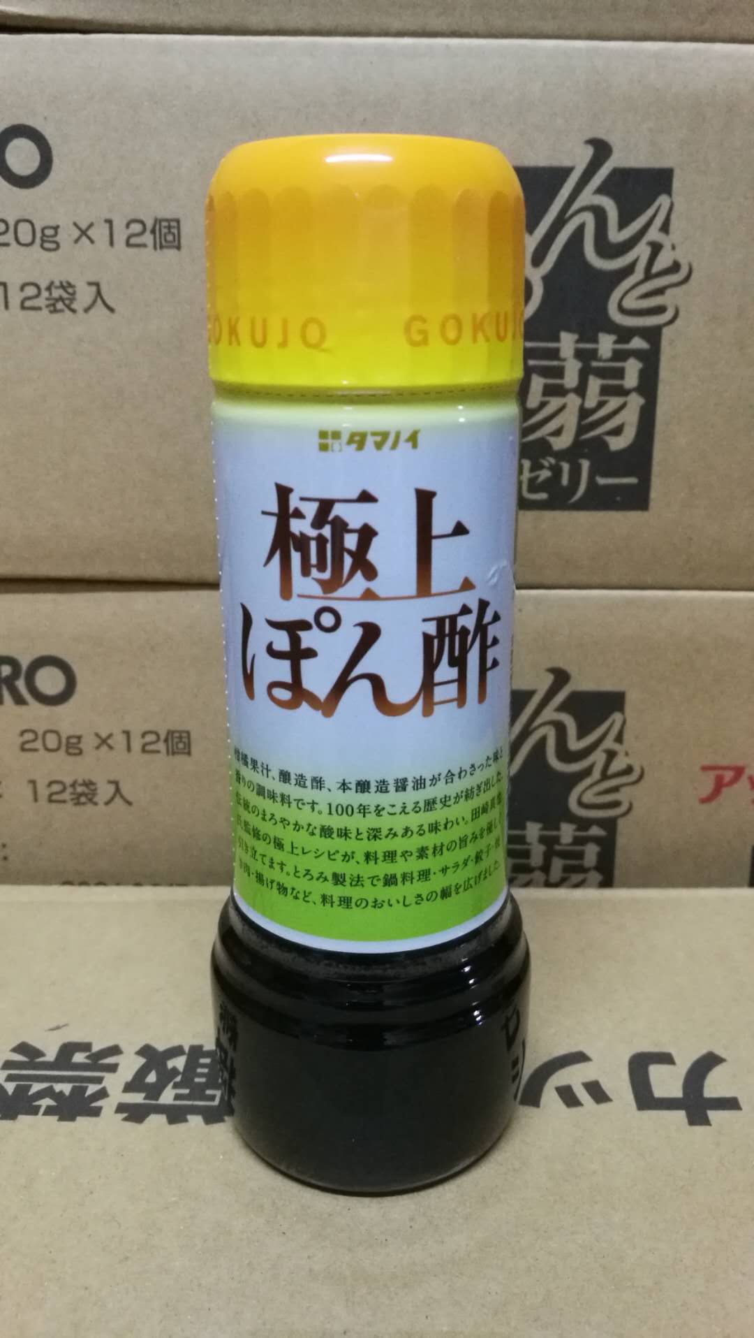 特長: 超過100年的歷史傳統的醇厚酸味與濃厚的味道,在料理中發揮著不可或缺的作用。是柑橘果汁、釀造醋、本釀造醬油混合調配而成的。使用於沙拉、肉類、炸物等料理中能增添食物的美味。