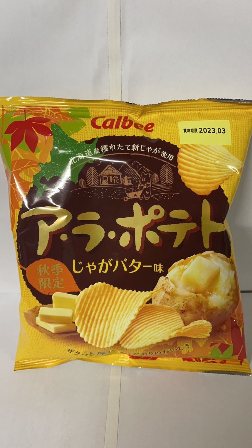 原材料名:土豆(北海道产100%),植物油,糖、乳糖,食鹽,糊精,白水解物、小麥、黃油奶粉、黃蜂粉、澱粉、醬油粉、酵母提取物粉、黃油、奶酪粉、發酵調味料、洋蔥粉/調味品(氨基酸等)、香料、甜味劑(甜菊、甘草)、焦糖色素67g