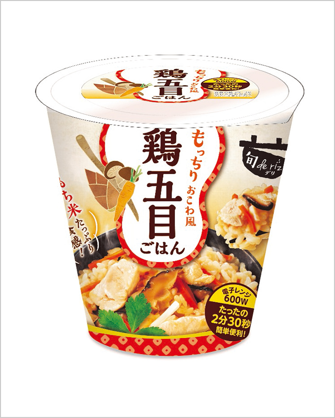 特長: ①与本公司独有的糯米和精米的配合比例,口感更为醇厚;混合5种配料(鸡肉、胡萝卜、竹笋、香菇、牛蒡) 口感更为丰富。是人气NO.1的即食饭。