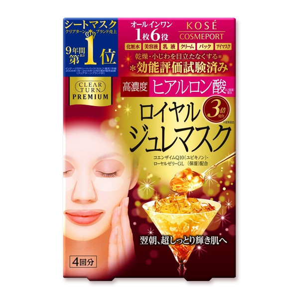 高絲kose 6效高濃度黃金果凍保濕面膜(玻尿酸)使用與肌膚相近的弱酸性配方,不添加任何色素、礦物油、硅成分和紫外線吸收劑,100%使用以植物細胞壁為主要成分製成的纖維素面膜紙,對肌膚溫和無害。配合3倍高濃度玻尿酸、葡糖胺、輔酶Q10、果凍精華等多種保濕成分,高效滲透肌膚角質層,充分滋潤肌膚,修復細紋。擁有化妝水、美容液、乳液、臉霜、面膜和眼膜6種功效,6效合一,僅僅使用一片面膜就能達到多種功效,輕鬆的就能對肌膚進行特別護理。散發優雅舒適的花卉香氣,使你的肌膚在得到滋潤的同時令你的身心也得到充分的放鬆。