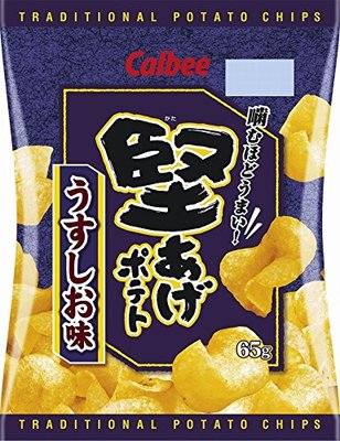 卡樂比香脆薯片(淡鹽味)嚴格選用農家上等非轉基因土豆,採用專庫溫濕度管控,保持土豆新鮮,同時低溫加工,將土豆的美味濃縮起來。按土豆規格調整切片厚度,配合新鮮棕櫚油和米油,讓薯片更加清香,經過獨特直火烘烤,口感堅脆,張弛有度而又口有餘香,讓人禁不住接二連三的拋入口中
