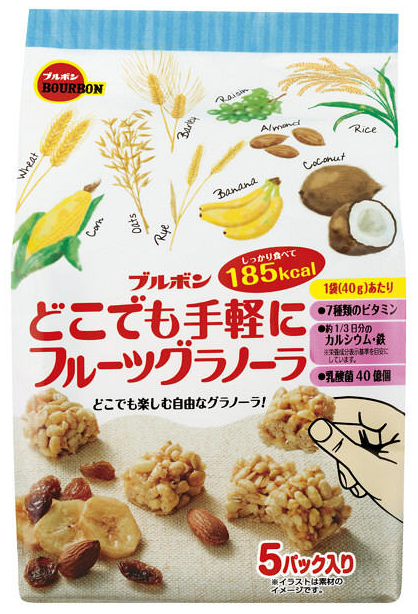 布爾本BOURBON水果格拉諾拉穀物零食使用了香蕉片、燕麥、玉米、杏仁、植物油、砂糖、葡萄乾、葡萄糖、椰子、椰子牛奶粉、麥芽糖、洋酒等多種原材料製作而成。6種穀物,配合椰子,富含7種維生素,人體所需的鈣、鐵,和40億個乳酸菌,對人體健康非常有益,能夠為身體補充充足的營養。清脆的食感,美味可口,一口就能吃完的大小,輕鬆方便。卡路里低,即使在減肥中的人也能放心享用不怕發胖。