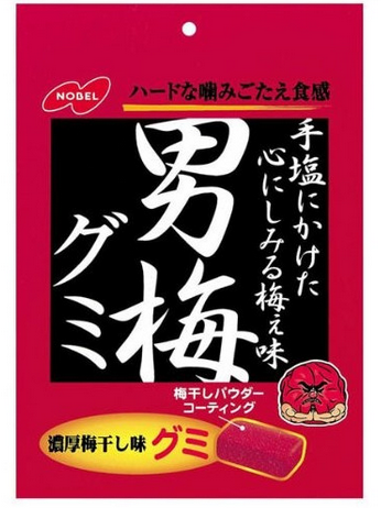 NOBEL男梅軟糖(濃厚梅乾味)使用了砂糖、麥芽糖、明膠、食鹽、梅乾粉、乳清蛋白、梅醋、梅肉、紅紫蘇、糯米紙、加工澱粉等原材料製作而成。還原梅乾本來的味道,口感偏硬,咬緊十足。軟糖表面上鋪滿梅乾粉末,酸酸甜甜,十分美味。能夠抑制食慾,加強臉部肌肉運動。