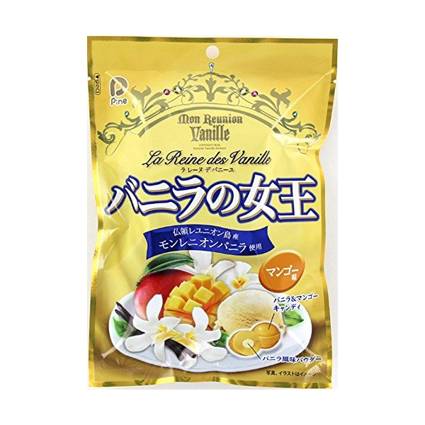 pine香草女王香草芒果糖使用了砂糖、麥芽糖、食用油、濃縮乳清、加糖煉奶、牛奶、芒果果汁、酸味料、食用香料等原材料製作而成。選用法國產的作為最高級珍藏的香草,配合香濃的芒果味,兩者完美融合。中間滿滿的填充散發清新香氣的香草風味粉末,使糖果整體食感更加豐富。