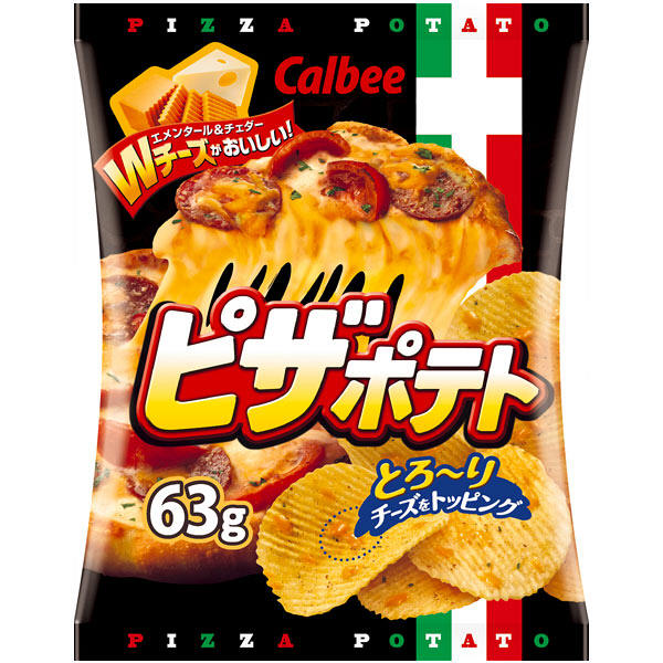 卡樂比薯片(芝士披薩味)嚴格選用農家上等非轉基因土豆,採用專庫溫濕度管控,保持土豆新鮮,同時低溫加工,將土豆的美味濃縮起來。按土豆規格調整切片厚度,讓你吃起來更加有口感。配合切達奶酪和埃曼塔爾奶酪兩種風味絕佳的芝士,加上各種肉類,番茄,香料,交織成濃厚香郁的芝士披薩風味薯片。