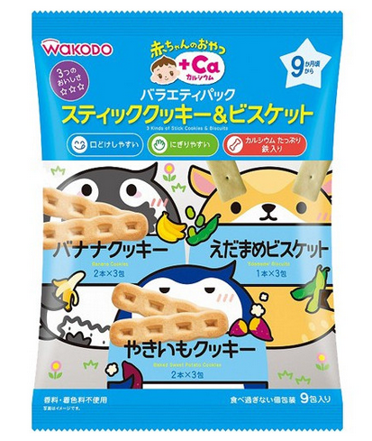 此款餅乾綜合包含有3種不同的餅乾,能夠同時享受3種不同的味道。因為餅乾上有空氣層和一些小洞,使唾液容易滲透,因此入口即溶。特地做成寶寶容易捉住的大小和形狀,可以幫助寶寶練習用手拿著食用。添加了豐富的鈣和鐵,補充孩子成長中所需的營養。獨立包裝,能夠控制寶寶食量,不會一次吃太多,同時方便出行攜帶。不添加香料、色素和保存劑。9個月起即可食用。