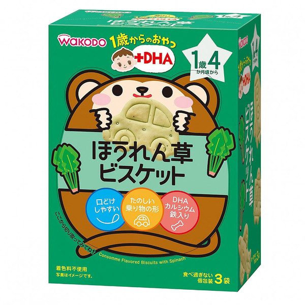 此款餅乾加入了菠菜泥,做成清湯風味,同時控制了甜度。添加了豐富的DHA、鈣和鐵,補充孩子成長中所需的營養。餅乾特地設計成各種可愛的交通工具的形狀,讓孩子和父母能夠一邊聊天一遍享受食用的過程。因為餅乾上有空氣層和一些小洞,使唾液容易滲透,因此入口即溶。獨立包裝,能夠控制孩子食量,不會一次吃太多,同時方便出行攜帶。不添加色素和保存劑。1歲4個月起即可食用。