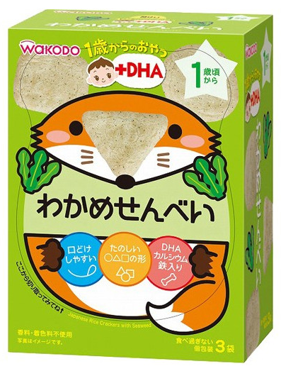此款仙貝使用了日本產的粳米,加入了海帶煉制而成。添加了豐富的DHA、鈣和鐵,補充孩子成長中所需的營養。餅乾特地設計成各種不同的形狀,讓孩子和父母能夠一邊聊天一遍享受食用的過程。因為餅乾上有空氣層和一些小洞,使唾液容易滲透,因此入口即溶。獨立包裝,能夠控制孩子食量,不會一次吃太多,同時方便出行攜帶。不添加色素和防腐劑。1歲起即可食用。