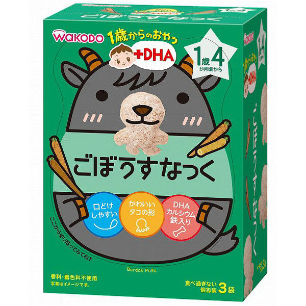 此款牛蒡泡芙使用了日本產的粳米,加入了牛蒡製作而成。鹽味。添加了豐富的DHA、鈣和鐵,補充孩子成長中所需的營養。餅乾特地設計成可愛的章魚形狀,讓孩子和父母能夠一邊聊天一遍享受食用的過程。因為餅乾上有空氣層和一些小洞,使唾液容易滲透,因此入口即溶。獨立包裝,能夠控制孩子食量,不會一次吃太多,同時方便出行攜帶。不添加色素和防腐劑。非油炸,可以安心給孩子食用。1歲零4個月起即可食用。