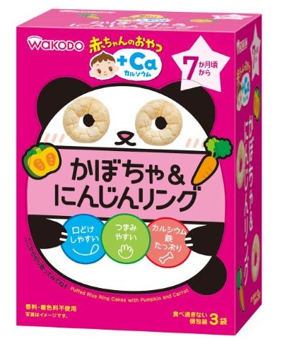 此款圈圈餅使用了日本產粳米,加入了南瓜和紅蘿蔔製作而成。因為餅乾上有空氣層和一些小洞,使唾液容易滲透,因此入口即溶。特地做成寶寶容易捉住的大小和形狀,可以幫助寶寶練習用手拿著食用。添加了豐富的鈣和鐵,補充孩子成長中所需的營養。獨立包裝,能夠控制寶寶食量,不會一次吃太多,同時方便出行攜帶。不添加香料、色素和防腐劑。非油炸,可以安心給孩子食用。7個月起即可食用。