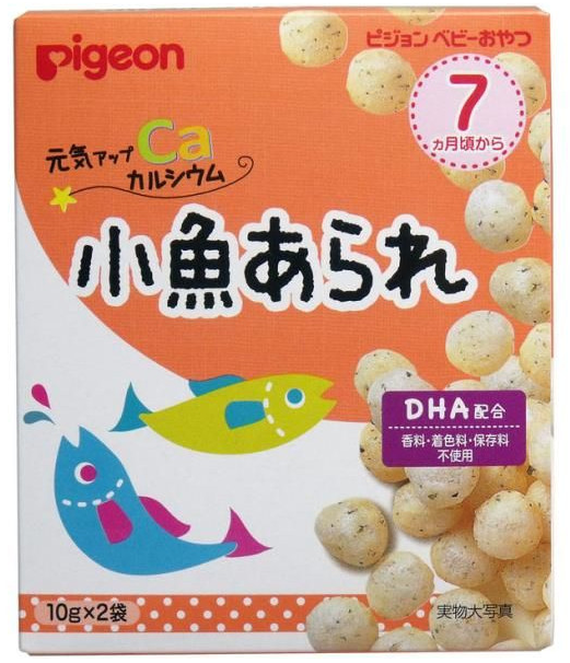 【原材料】糯米(泰國產)、玉米澱粉、砂糖、貝類提取物、食鹽、青海苔、乳清鈣、魚乾粉、含有DHA的精製魚油、加工澱粉、碳酸鈣、(原材料的一部分含有牛奶成分、大豆)
