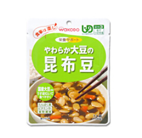 ◎ 採北海道產的大豆與昆布,細細炊煮而成!富有豐富蛋白質、維他命B1、食物纖維的大豆昆布煮!本品為配菜類,可配飯配麵;食材柔軟易消化,用舌頭就能弄碎,最適合高齡長輩。