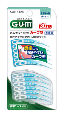 柔軟的橡膠毛刷。有弧度的手柄易於牙齒深處清潔。不使用金屬絲線。同時可以按摩牙齦。盒裝,攜帶方便。無添加香料。型號SSS~S(纖細型):形狀由尖端SSS到根部S逐渐變寬