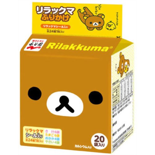 雞蛋,鮭,蔬菜,木魚花四種口味。含鈣。每個包裝都有不同的輕鬆熊圖案。