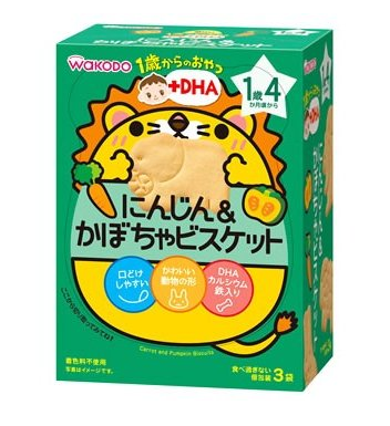 成分:小麥粉、起酥油、砂糖、蔬菜粉(胡蘿蔔、南瓜)、脫脂奶粉、澱粉、食鹽、含DHA精緻魚油等。